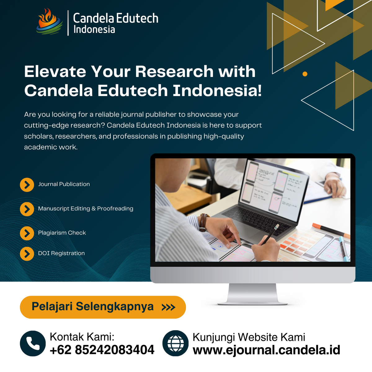 Candela Edutech Indonesia manages eight internal journals and collaborates with various partner journals covering diverse types, indexes, and scopes. We also offer book publication services, intellectual property rights (HKI) management, and assistance in converting final projects into books or articles.